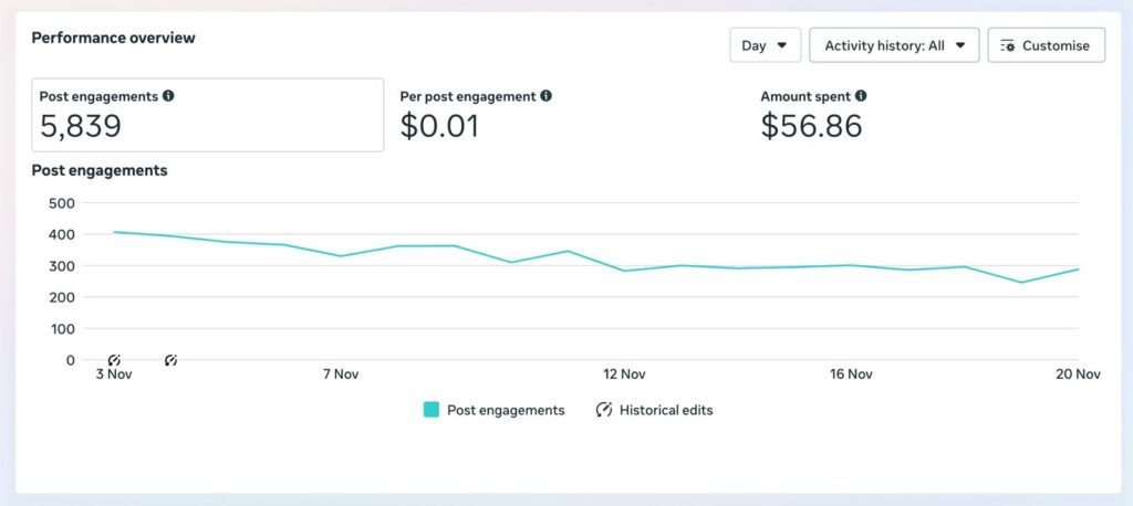 The campaign generated 5,839 post engagements at an average cost of $0.01 per engagement, with a total ad spend of $56.86.